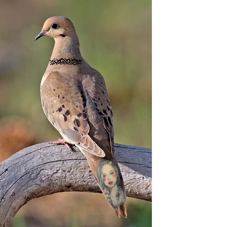 This mourning dove doesn’t just have a badass tribal band across its neck, it also has a sick tattoo of a blushing young woman with braids on its tail feathers.