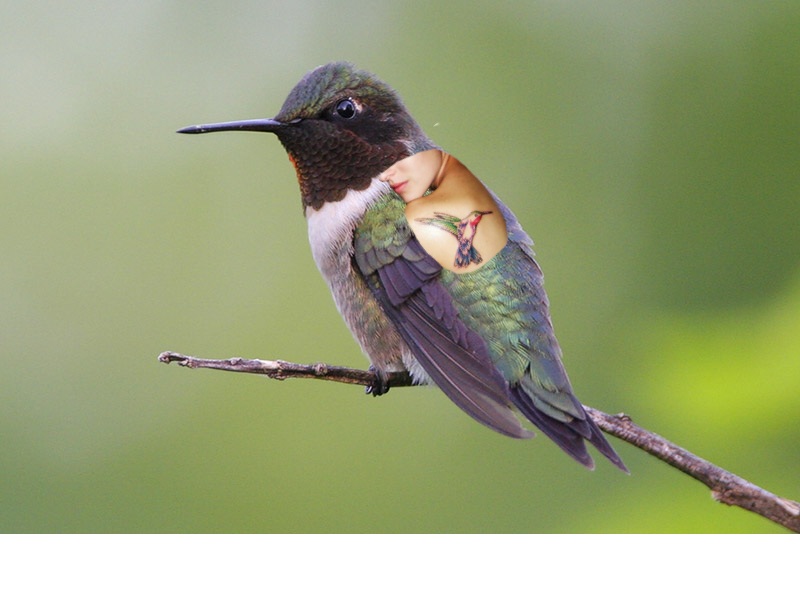 This one is a conceptual masterpiece. This ruby throated hummingbird got a back shoulder tattoo of a young woman with a back shoulder tattoo of a ruby throated hummingbird. Just incredible!